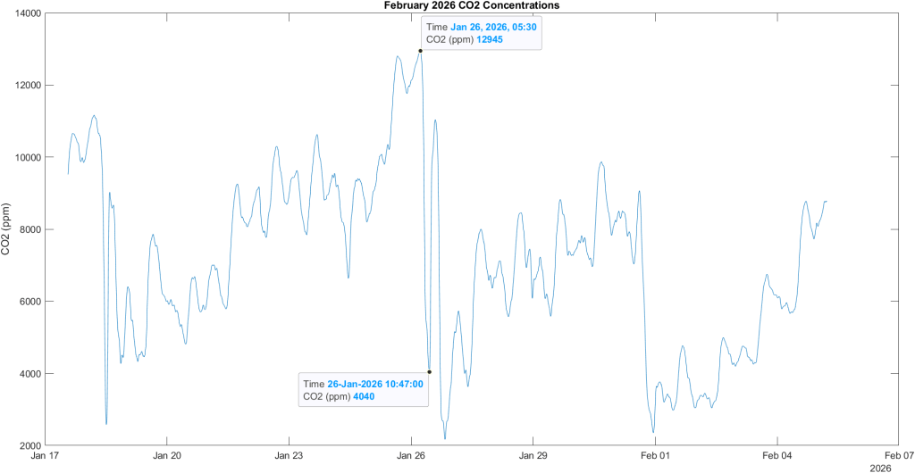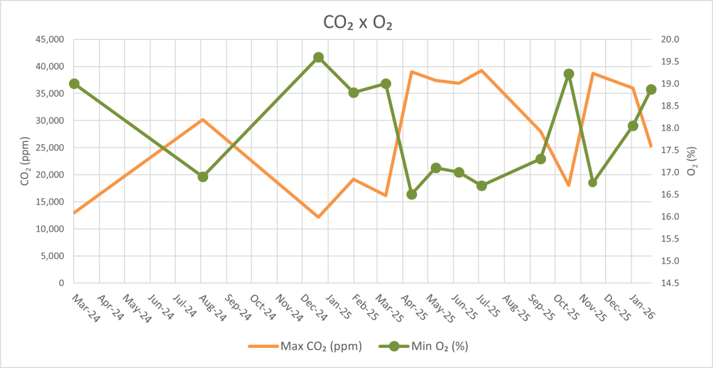 A total of 13 air monitoring trips were conducted from March 2024 through February 2026. There were no trips in August 2025 due to very low oxygen levels observed during the June 2025 trip. Air readings were displayed live on an LCD during the trip and automatically saved to an SD card every minute. Readings from the September 2025 trip were estimated based on the LCD readout, due to an SD card failure. Water level measurements from the staff gauge in the lake room were also collected on each trip.