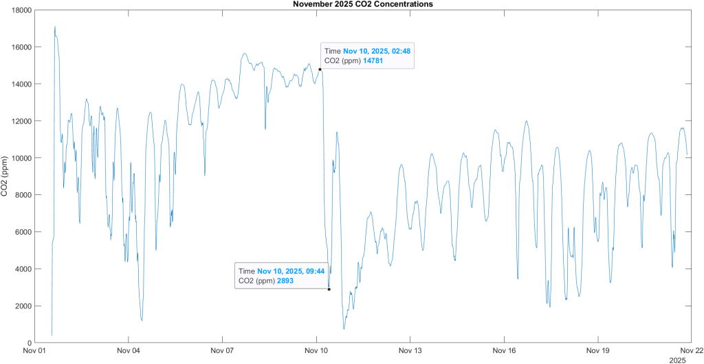 Over the sampling period of 3 weeks, a cold front was observed on November 10th. This event moved a large amount of air in the cave and CO2 concentrations dropped from 14,000 to 2,800 ppm. Even during the cold fronts there were still two daily highs and lows observed.