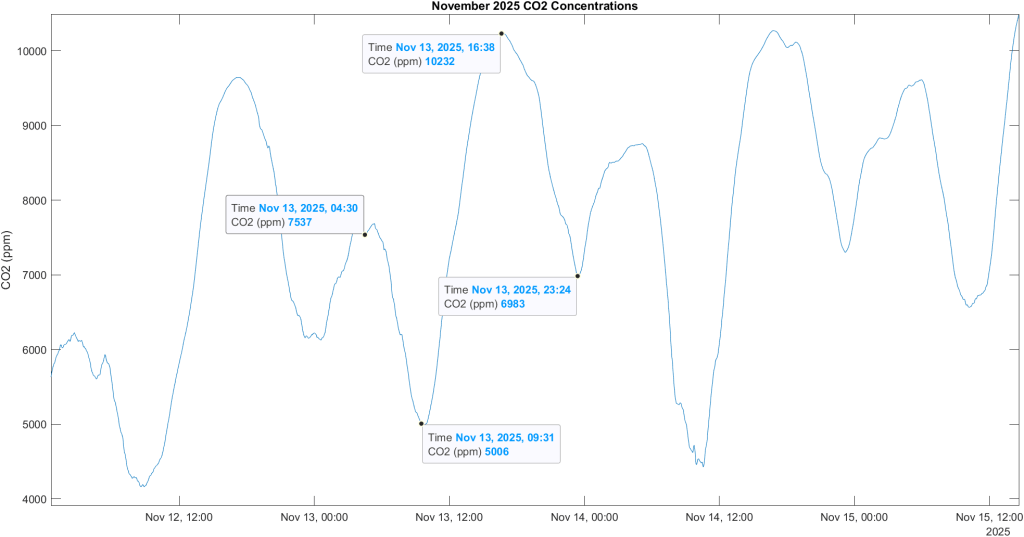 The time series data gave a detailed look at how the cave “breathes” each day. CO2 peaks were consistently observed twice a day around 4 am and 4 pm. CO2 valleys occurred daily around 9 am and midnight.