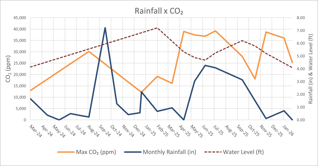 Monthly trips showed an inverse relationship between CO2 and O2. In the warmer summer months, the CO2 increased and the O2 decreased, and vice versa in the winter months. Hurricane Helene recharged the cave dramatically, and unseasonably high water levels were observed during the January 2025 trip. The air quality was “good” during this trip with O2 reaching a minimum of “only” 19.6%. The southern area opened around 5’ 4” on the staff gauge and air quality dropped when this was observed in April 2025. As water levels continued to drop air quality slightly improved in the southern section, but it always remained at very high CO2 levels (~30,000 ppm).